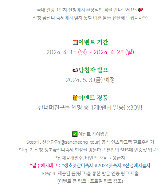 산청 꽃잔디축제는 이름만 들어도 설레는 봄의 대표적인 축제예요. 아름다운 꽃잔디 군락지와 함께하는 다양한 체험활동, 먹거리 그리고 문화공연까지. 이 모든 것이 어우러져 방문객들에게 잊지 못할 추억을 선사한답니다. 축제의 아름다운 순간을 담아가고 싶으시다면, 산청 꽃잔디축제에 꼭 한 번 방문해 보세요. 분홍색의 꿈같은 세계가 여러분을 기다리고 있을 거예요.